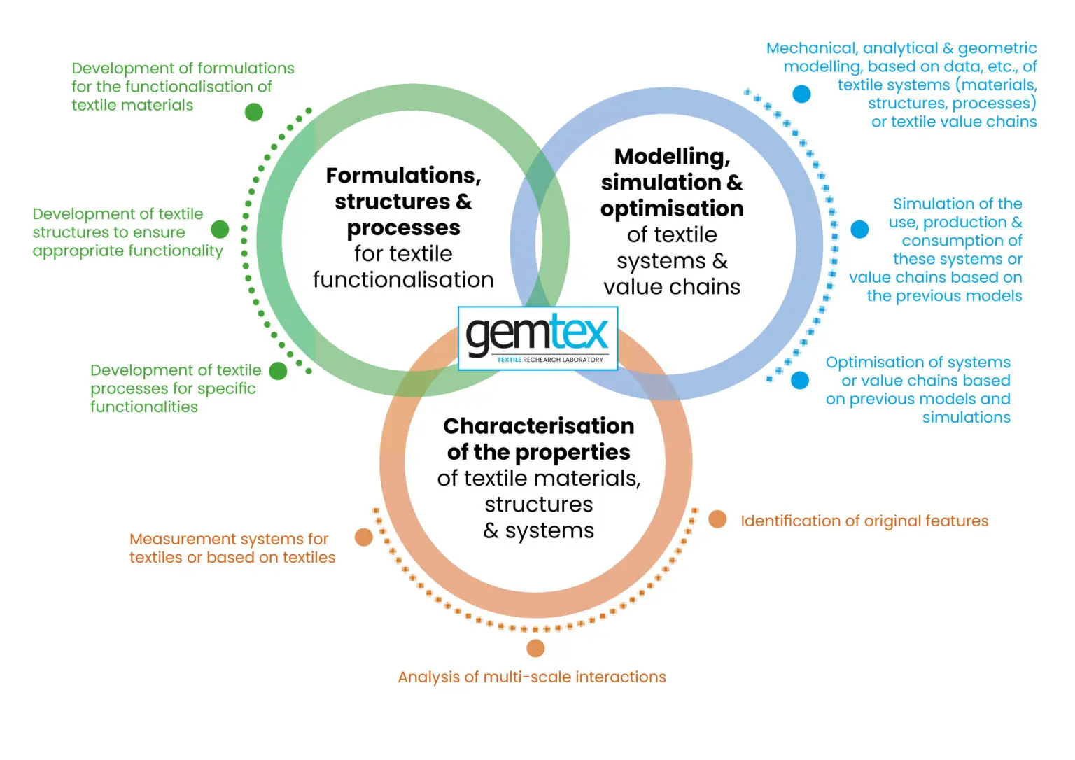 All activities are organised around three research areas, encompassing all the unit’s research projects and technology platforms, namely: (i) modelling, simulation and optimisation of systems and value chains in the textile sector, (ii) the physics of textile materials, structures and systems, and (iii) formulations, structures and processes for the functionalisation of textiles..