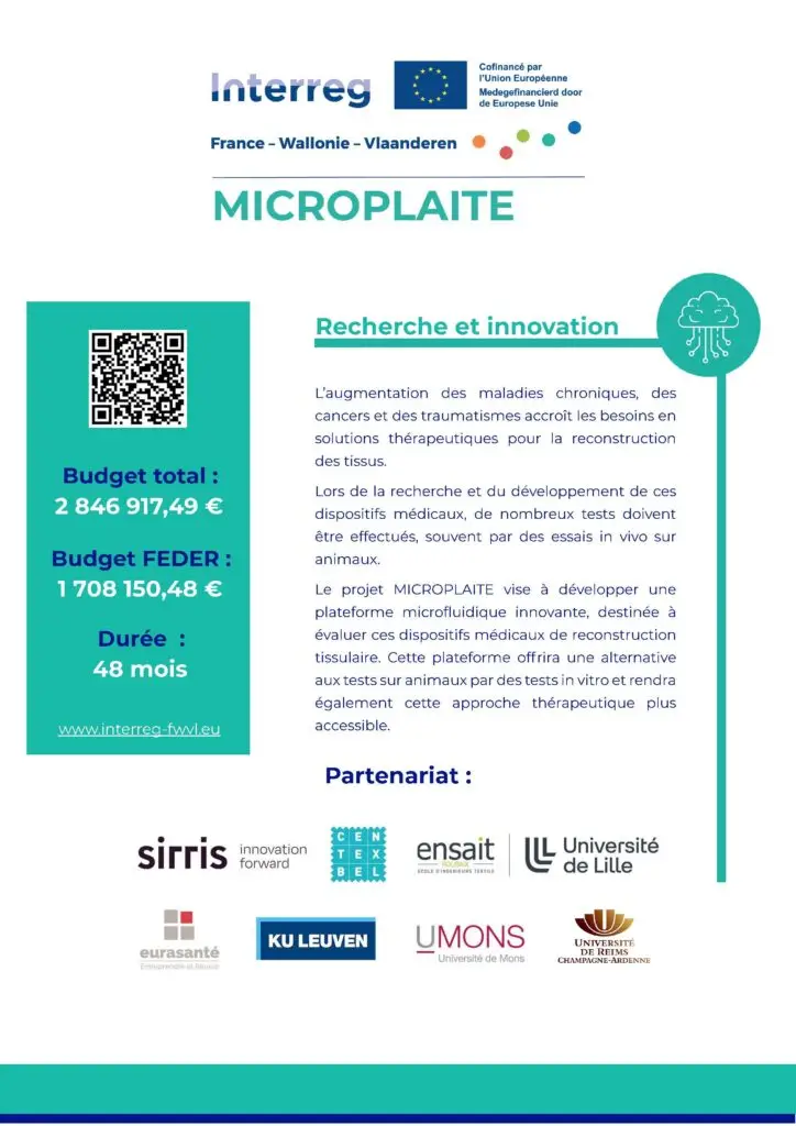 The GEMTEX laboratory will contribute to the MICROPLAITE project by producing new supports for tissue reconstruction. Not only cell growth, but also the study of their biocompatibility, as well as various properties they might have, such as antimicrobial properties, are aspects studied for the design of structures on all scales. (Polymers, yarns, knitted contexts). The structures will act as scaffolds for tissue regeneration, and will be tested using microfluidic platforms set up by SIRRIS.